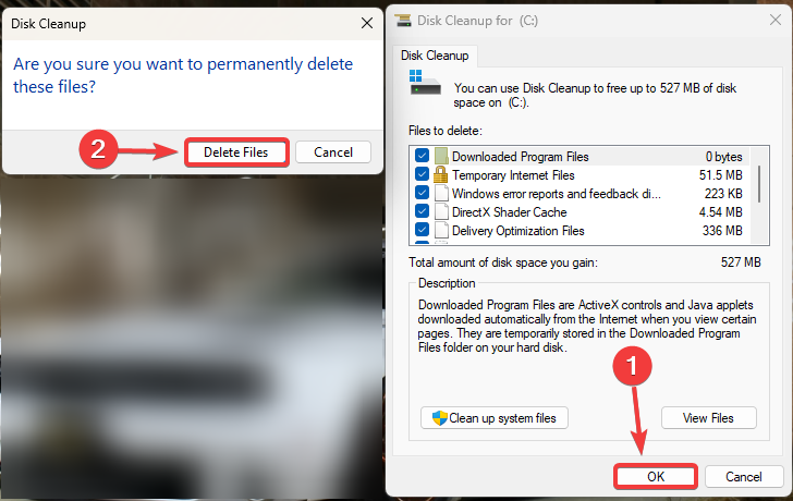 - Under the Files to Delete section, tick all the options and click OK. Then, click Delete Files to confirm the action.