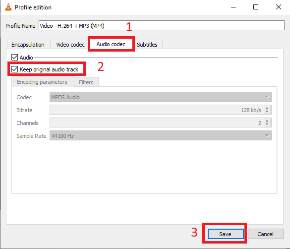 - Click the gear icon > Audio codec > check Keep original audio track, then click Save.