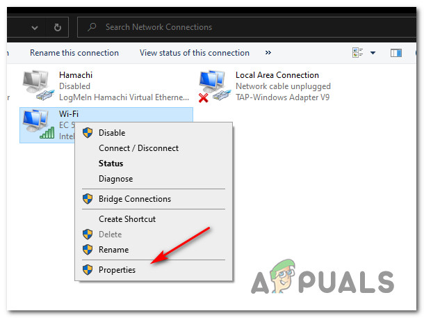 Accessing the Network Connections window - Once you’re inside the Network Connections window, go ahead and right-click on the connection that you’re actively using – Wi-Fi (Wireless Network Connection) or Ethernet (Local Area Connection). Next, click on Properties from the newly appeared context menu.