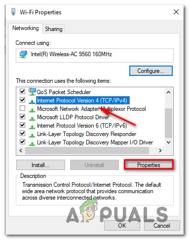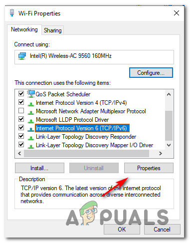 - Next (once you’re inside the Ethernet or Wi-Fi properties menu), click on the Network tab from the menu at the top, then go to the This connection uses the following items section.