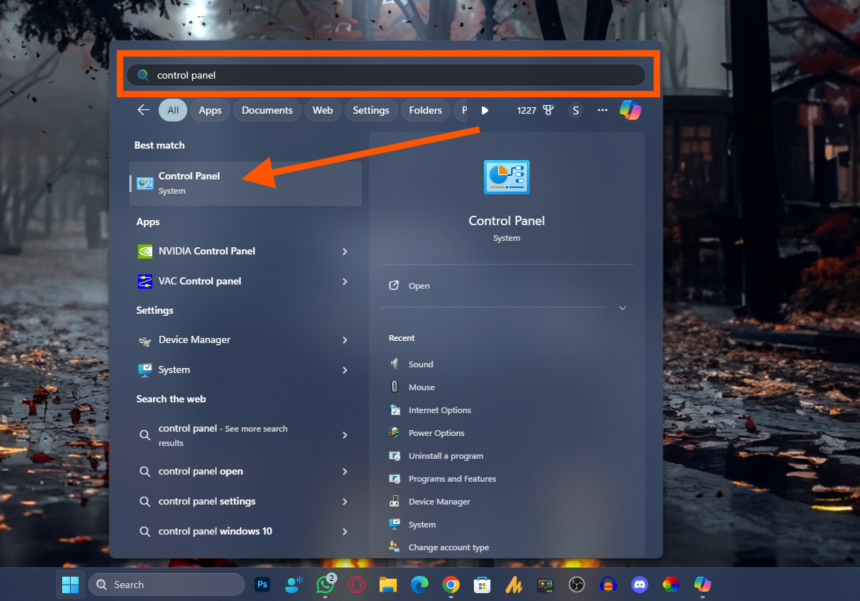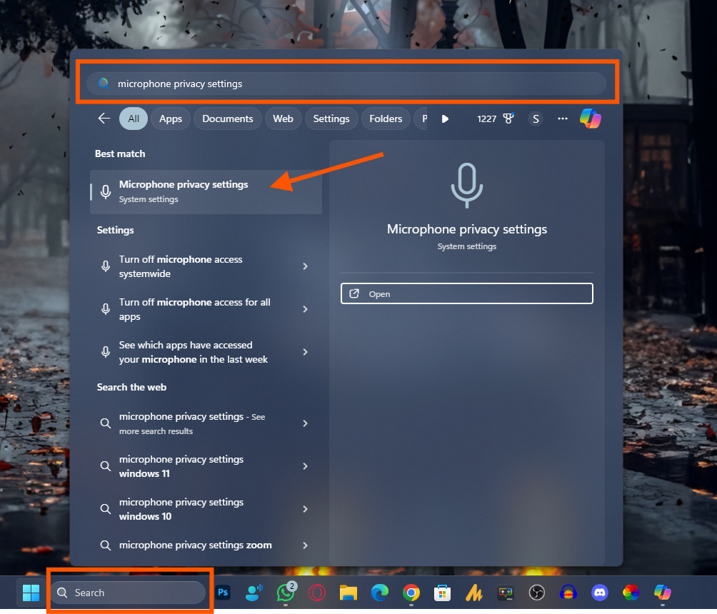- Type “microphone” into the search bar at the bottom middle of the taskbar & click Microphone privacy settings.