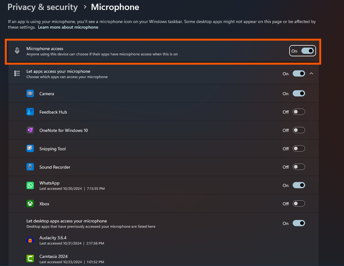 - Ensure “Let apps access your microphone” is toggled on. Select which apps you want to grant microphone access.