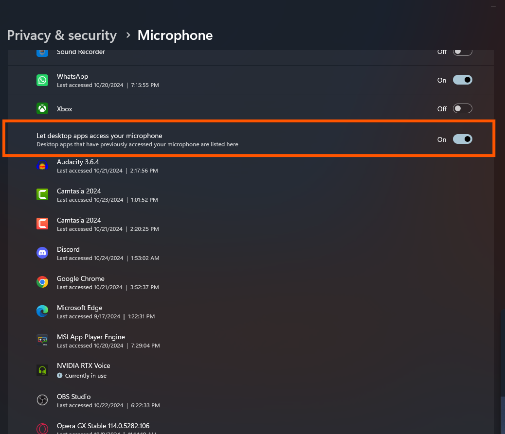 - Scroll down until you see “Let Desktop Apps Access your Microphone” and ensure the toggle mode is on.