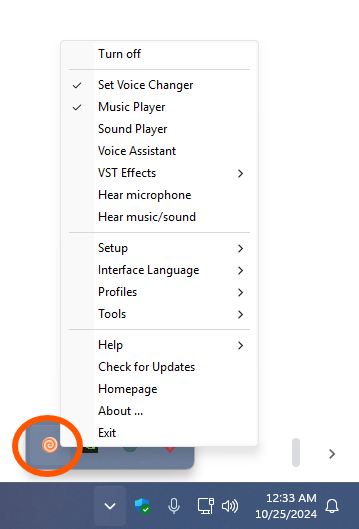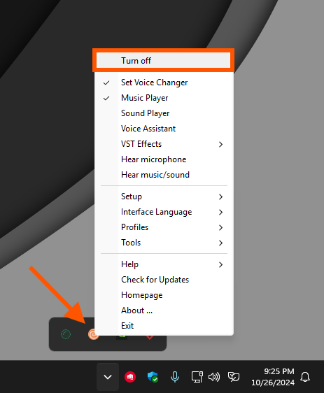 - Right-click on the Clownfish Voice Changer tray icon and ensure it is turned on. If it says “turn off,” your Clownfish Voice Changer is active. If it says “turn on,” click to activate it.