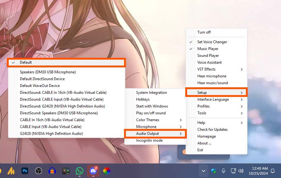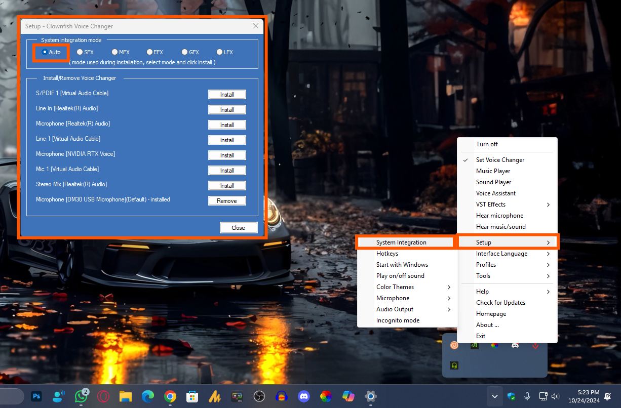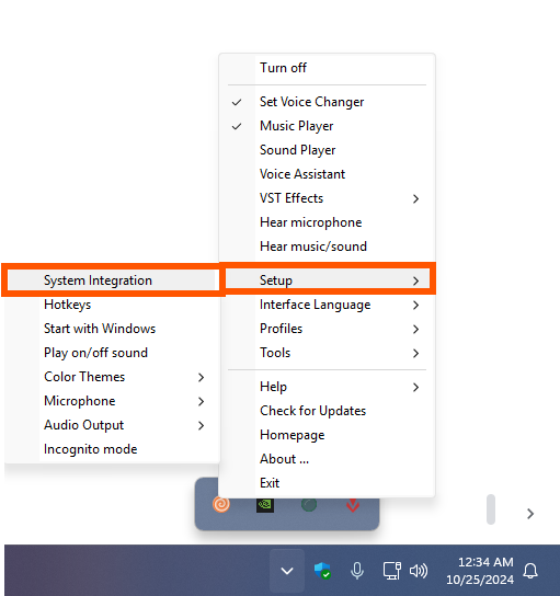 - Right-click on the Clownfish Voice Changer tray icon > Setup > System Integration.