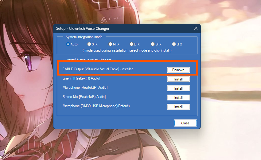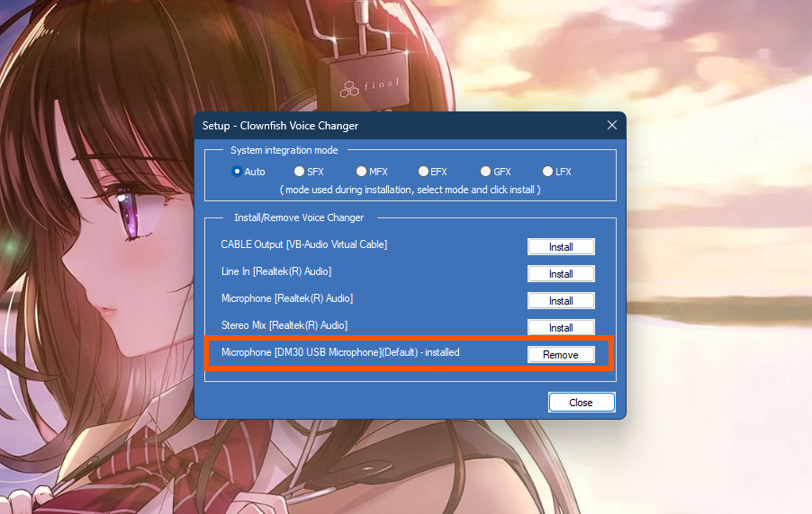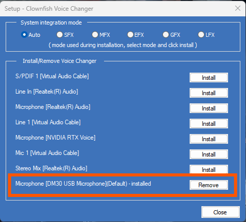 - In Install/Remove Voice Changer, find your current default microphone. If it’s installed, remove it and reinstall it.