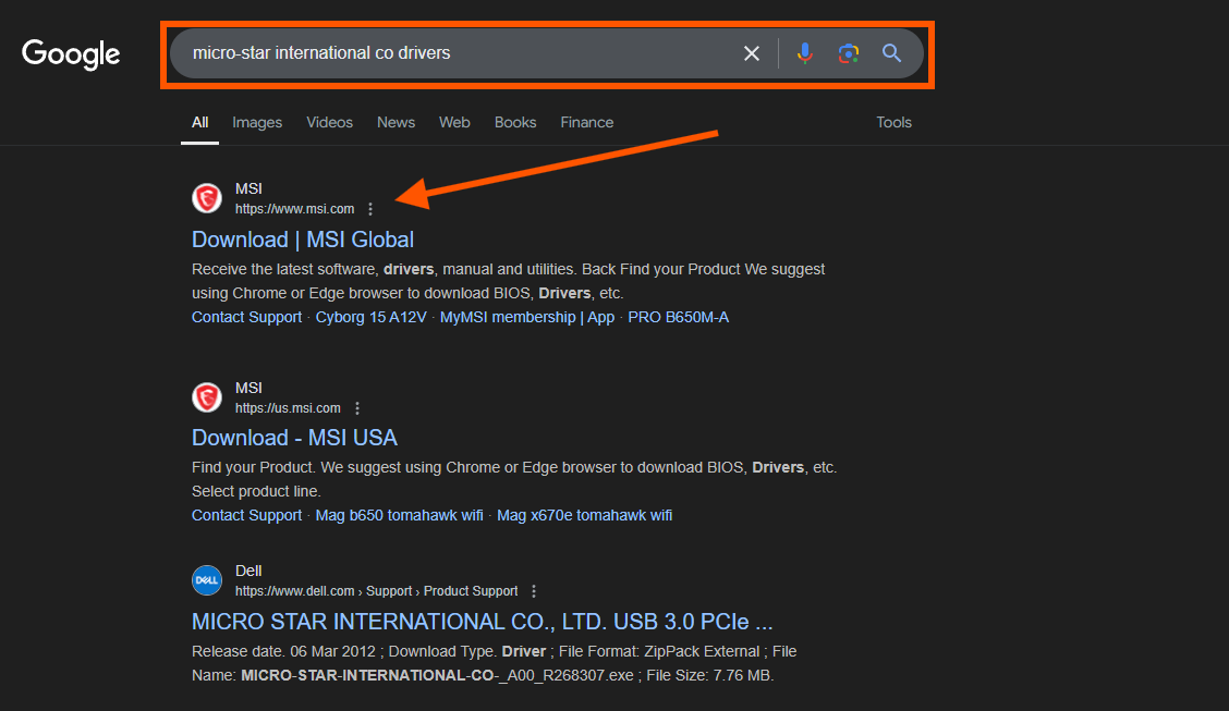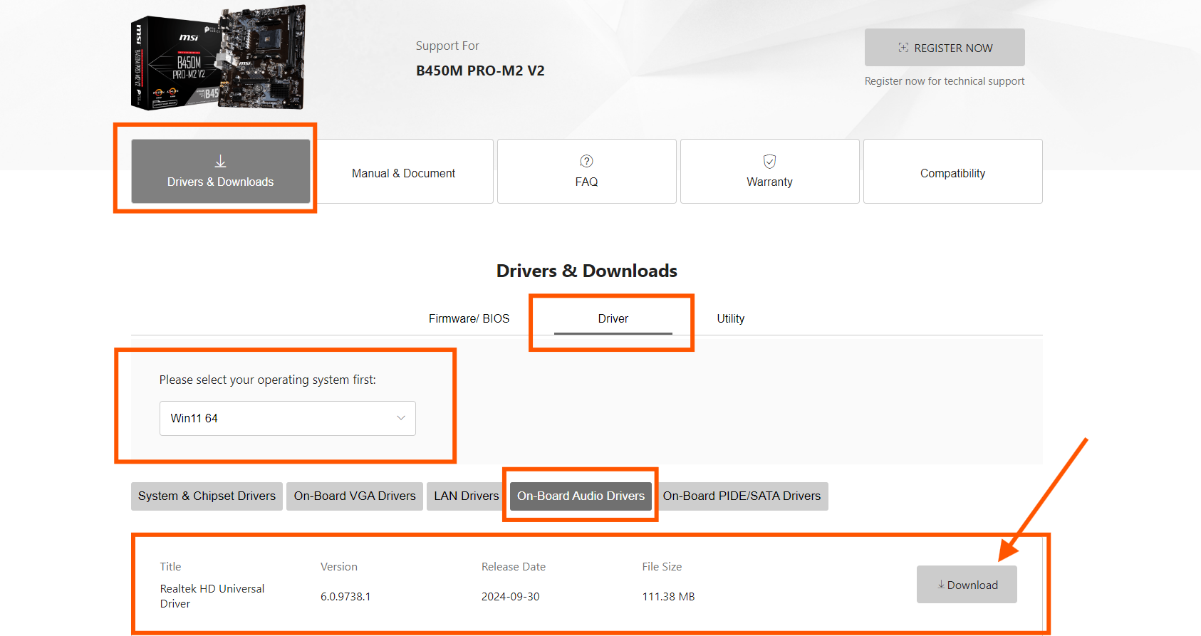 - Use a web browser > search Baseboard Manufacturer name and click on the Top First Website to find hardware-related drivers like Audio Drivers.