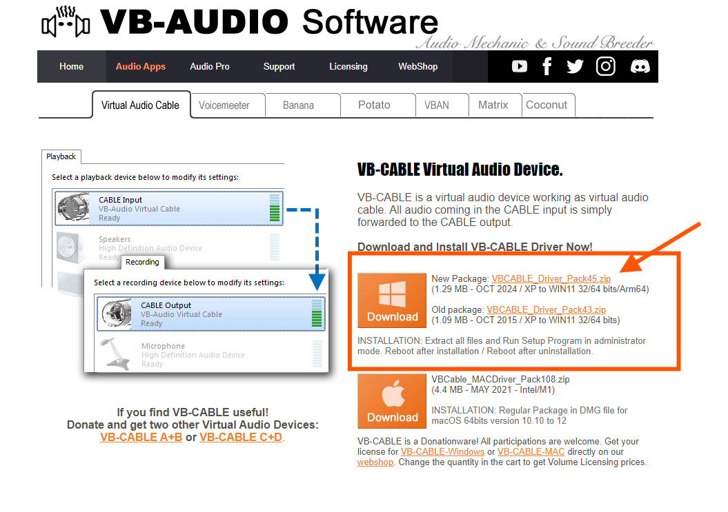 - Visit the official website to download the VB CABLE Virtual Cable.