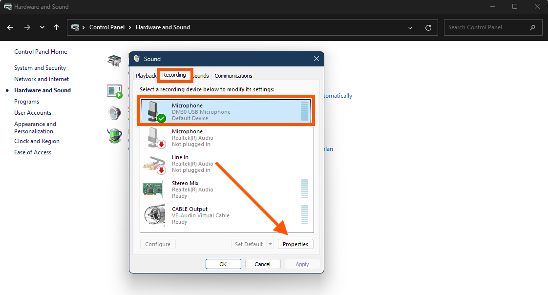 - In the Sound Window, click on the “Recording” tab and select your microphone.