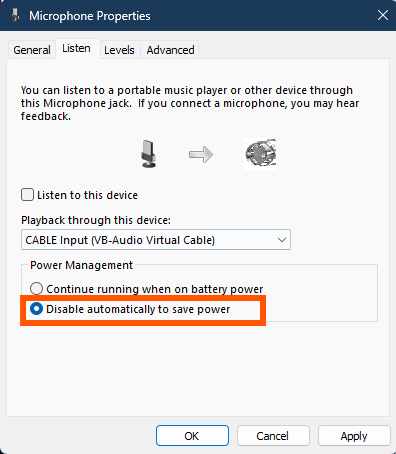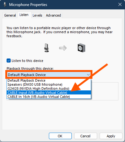 - Hit “Apply” and then click “OK”. Now, whatever you speak into the microphone will be transmitted through VB Cable.
