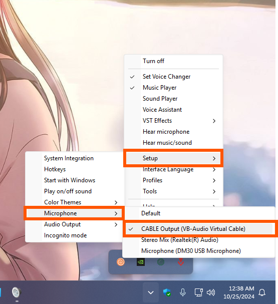 - Right-click the Clownfish icon again, go to Setup > Microphone > VB Cable Output.