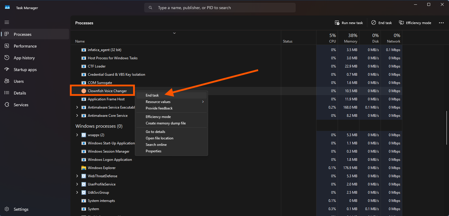 - Close Clownfish Voice Changer from Task Manager and relaunch it. This should resolve the issue.
