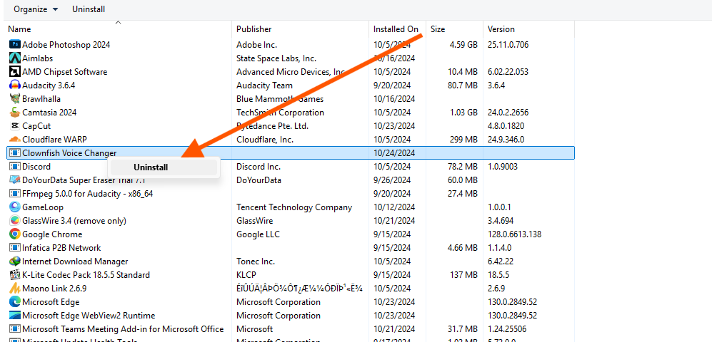 - Find “Clownfish Voice Changer“, Right-Click > Uninstall.