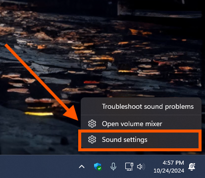 - Right-click on the speaker icon in the bottom right corner of your screen and select “Sound settings“.