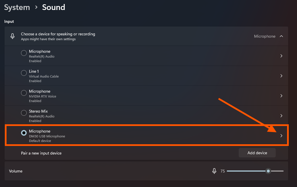 - In the input section, click on the arrow to the right of the microphone you want to use.