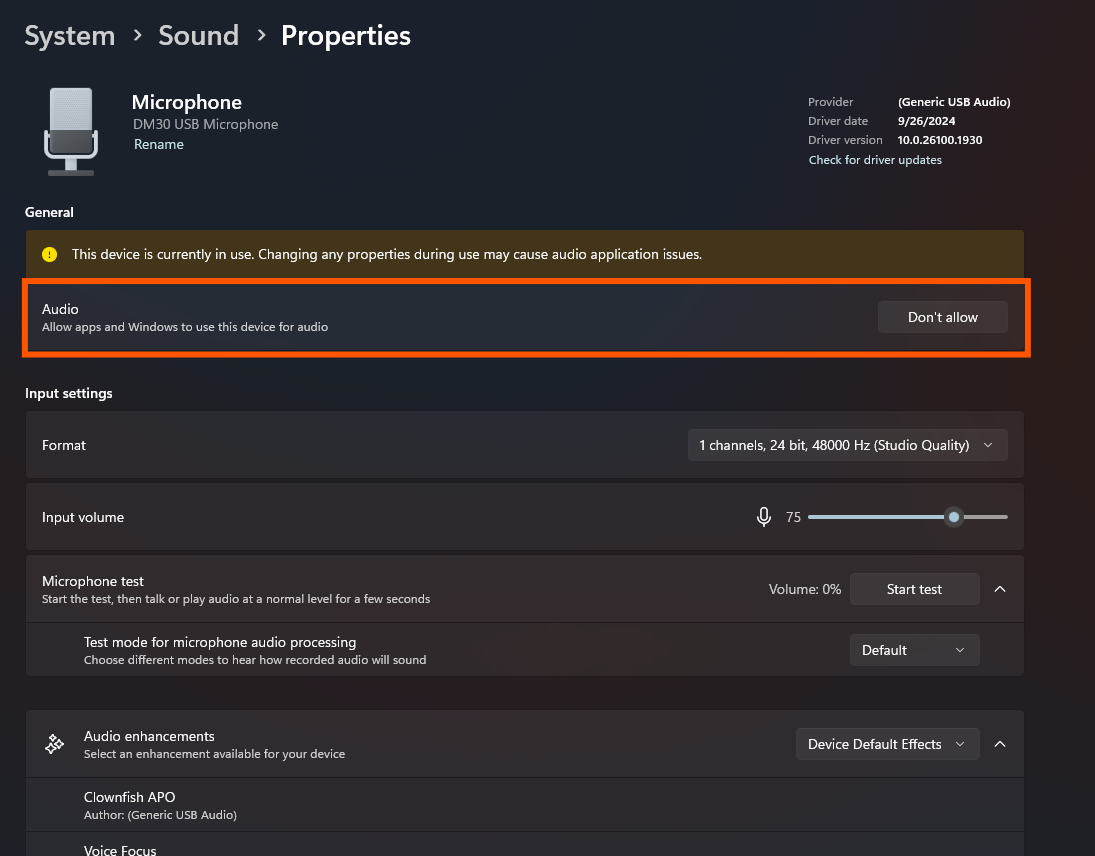 - Under General, you’ll find a box labeled “Allow” or “Don’t Allow.” If it says “Allow,” this means your microphone is not permitted. Click “Allow” to grant access. If it says “Don’t Allow,” it indicates your microphone has permission and is operational.