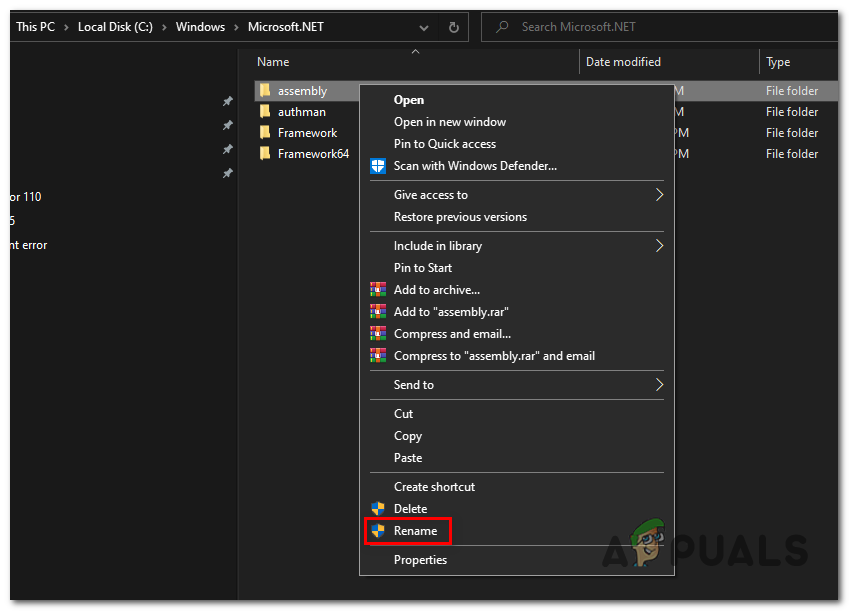 Renaming the assembly folder - When you’re prompted by the UAC (User Account Control), click Yes to grant administrative privileges.