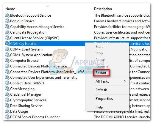 Note: Keep in mind that depending if the CNG Key Isolation service is currently in use, you might encounter an unexpected system reboot. Do not restart this service unless you have legitimate reasons for doing so.