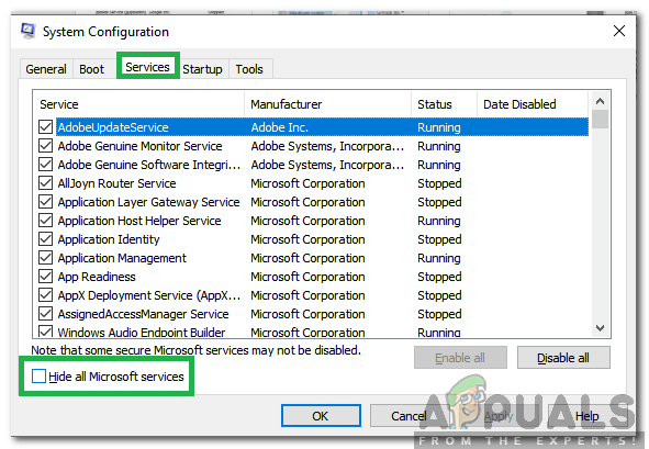 Opening System Configuration - Once you’re inside the System Configuration screen, select the Services tab from the menu at the top, then start by checking the box associated with Hide all Microsoft services.