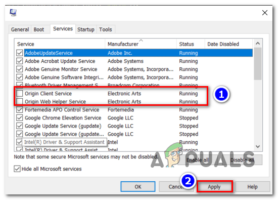 - Once the services are ordered properly, scroll down through the list of services and locate the two associated with Electronic Arts (Origin Client Services and Origin Web Helper Service). After you spot them, uncheck the boxes associated with each of them and click on Apply to save the changes.