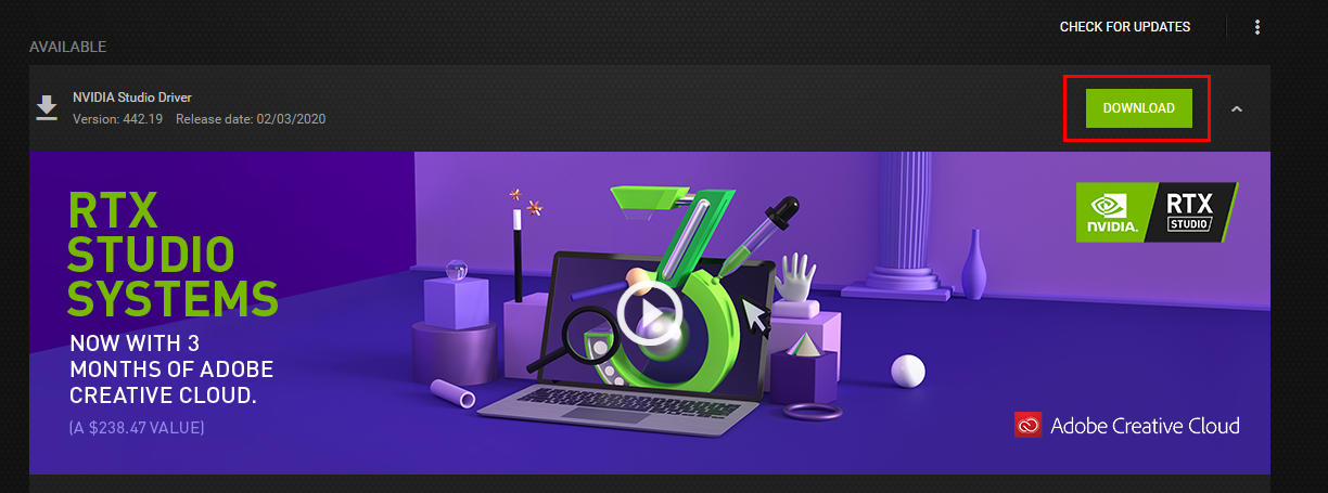 Changing the driver preference mode to Studio Driver - After you do this, the available driver will change. Check to see if the Studio driver is scheduled for download, then click on the Download button associated with it to start the download.