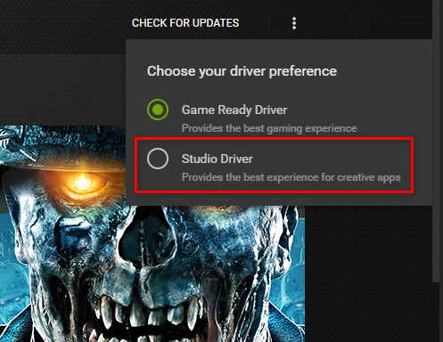 Accessing the action button of Drivers in GeForce Experience - Inside the Action button, change the default driver preference from Game Ready Driver to Studio driver.