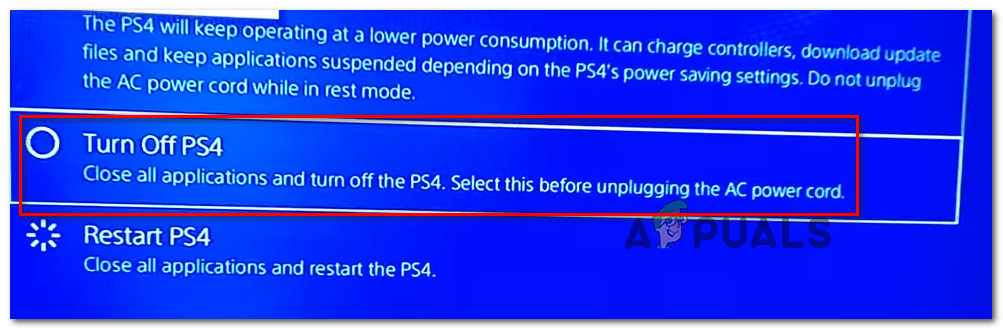 - Press and hold the PS button on your console until the Power Options menu pops up. Once it does, select Turn off the PS4 option from the list of available options and press X on your controller.