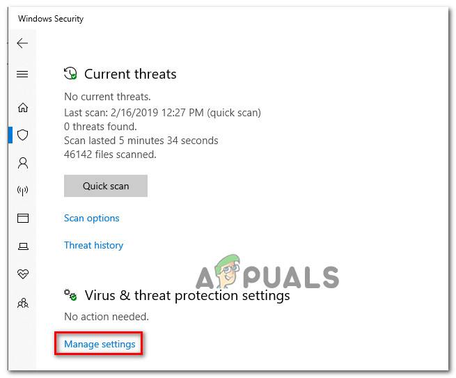 Accessing the Virus & Threat protection screen - From the Virus & Threat protection screen, click the Manage hyperlink (under Virus & threat protection settings)