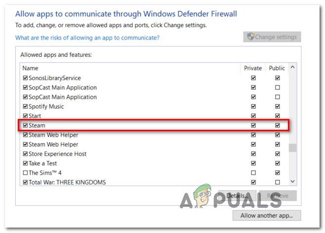 Allowing an app or feature through Windows Defender - Once you arrive in the Allowed apps menu, click on the Change settings button and click Yes at the User Account Control (UAC) prompt to grant administrative privileges.