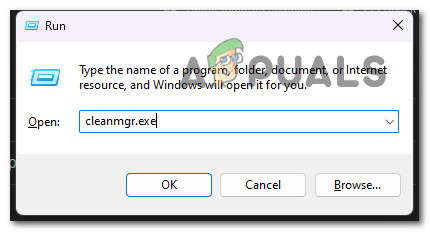 - Inside the Run dialog box that just appeared, type ‘cleanmgr.exe’ and press Ctrl + Shift + Enter to open up the Disk Cleanup utility with admin access.