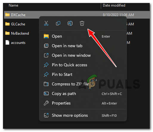 - Right-click on DXCache folder and choose Delete from the context menu.