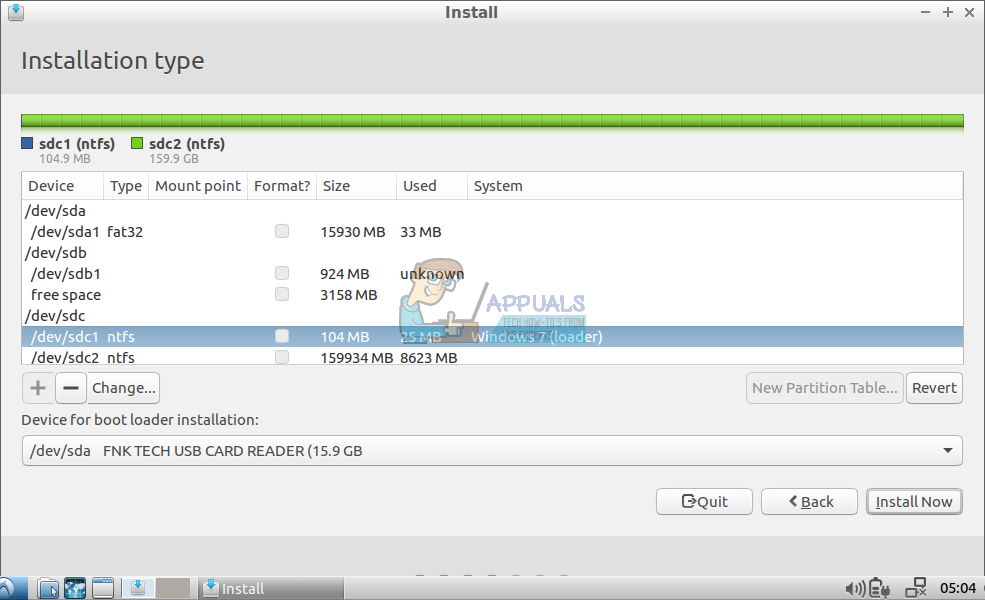 You can still select “Something Else” even if you didn’t do anything before in the terminal. You’ll be given a graphical representation of all the volumes attached to your system. Look out for volumes formatted to the NTFS structure, since this is what Windows 7 prefers for boot devices.