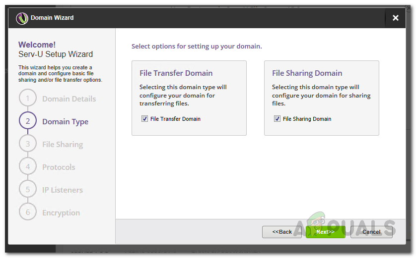 Providing Domain Details - On the Domain Type screen, choose what you want the domain to be used for i.e. file transfer or file sharing. Click Next.