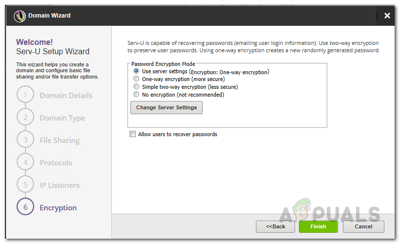 SFTP Server Listeners - If you chose File Transfer, you can choose the password encryption mode on the Encryption screen. In case you want to enable password recovery through the HTTP login page, tick the Allow users to recover passwords option.