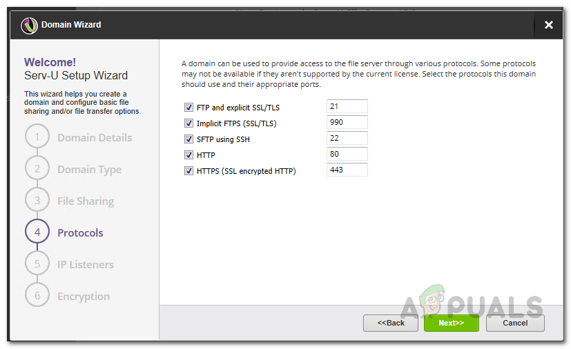 - In case you chose the File Transfer option, you will be seeing the Protocols screen instead. Here, choose the protocols to be used along with the respective ports. Then, click Next.