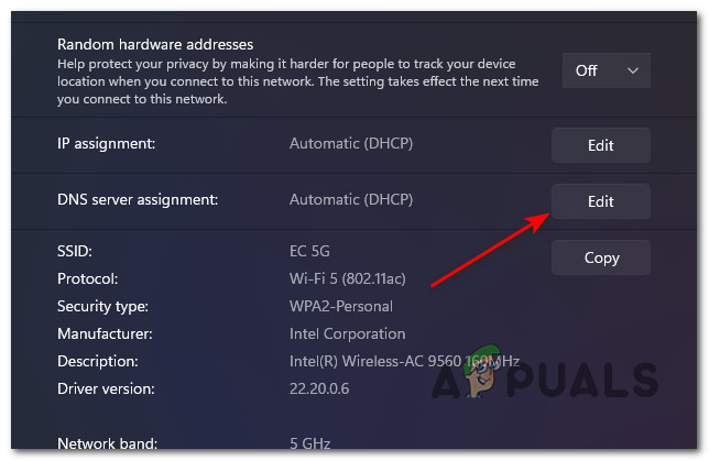Accessing the Properties screen - Inside the dedicated Properties menu, click on the Edit menu directly under DNS server assignment on the right-hand side.