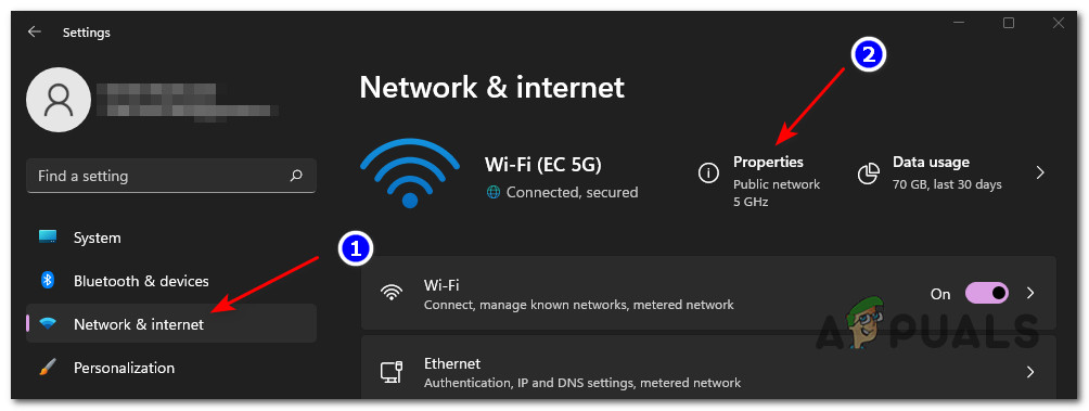 - Next, move over to the menu on the right and click on the Properties box associated with the network that you’re actively connected to.