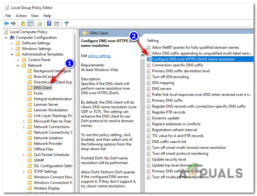 - Once you arrive inside the correct path, move over to the menu on the right, then double-click on the Configure DNS over HTTPS (DoH) name resolution policy.