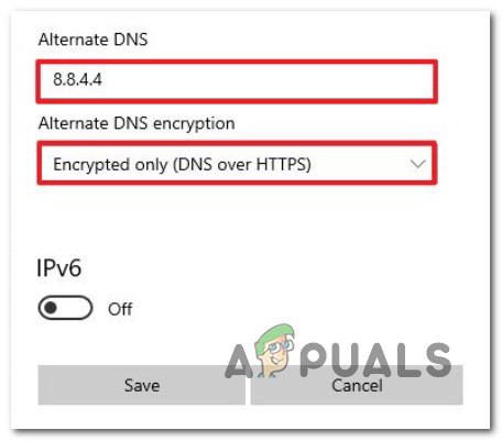 - After you’ve made sure that you’ve typed in the correct values, select Encrypted only (DNS over HTTPS) from the Alternate DNS encryption menu (under IPv6).
