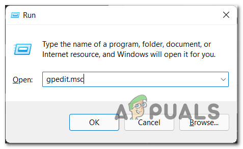 - Press Windows key + R to open up a Run dialog box. Next, type ‘gpedit.msc’ inside the text box, then press Enter to open up the Group Policy Editor utility on Windows 11.