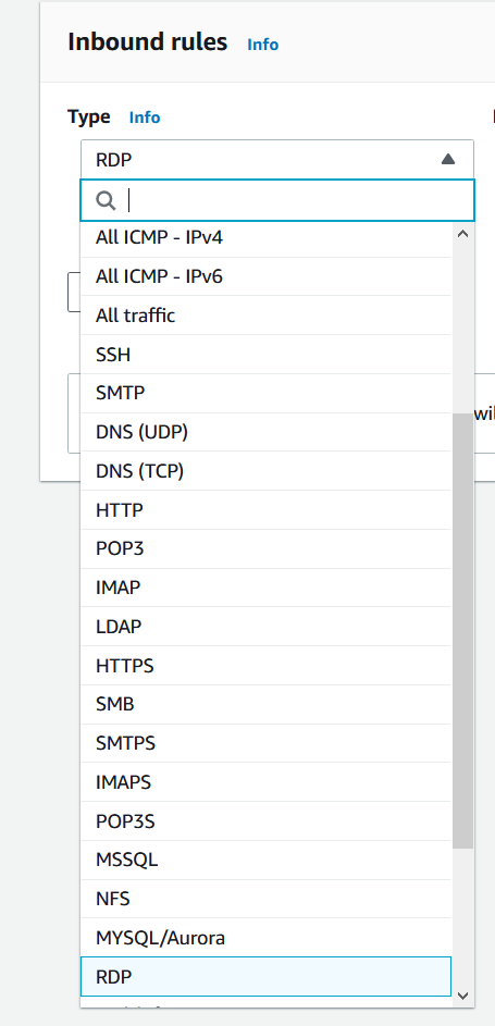 - Type – from the list choose HTTPS. You can choose a common protocol, such as SSH (for a Linux instance), RDP (for a Windows instance), or others. You can also manually enter a custom port or port ranges. There are more than 30 protocols that can be configured. In case you want to enable DNS, IMAP, SMTP, or other protocols, you can do it by following the same procedure as with configuring HTTPS protocol.