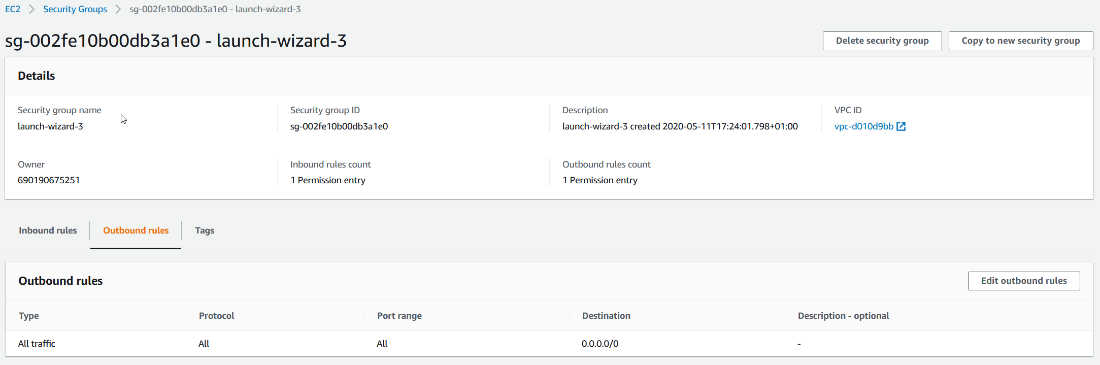 - outbound rules – create outbound rules used to define outgoing communication to your Amazon EC2 instance. By clicking on view, you can see existing outbound rules.
