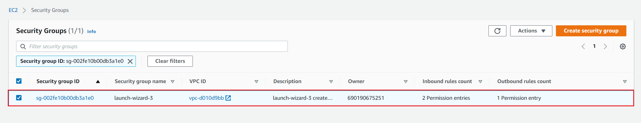 - launch-wizard-3 – the name of the security group. It is used to configure inbound and outbound rules for the EC2 instance. In our case, the name is launch-wizard-3.