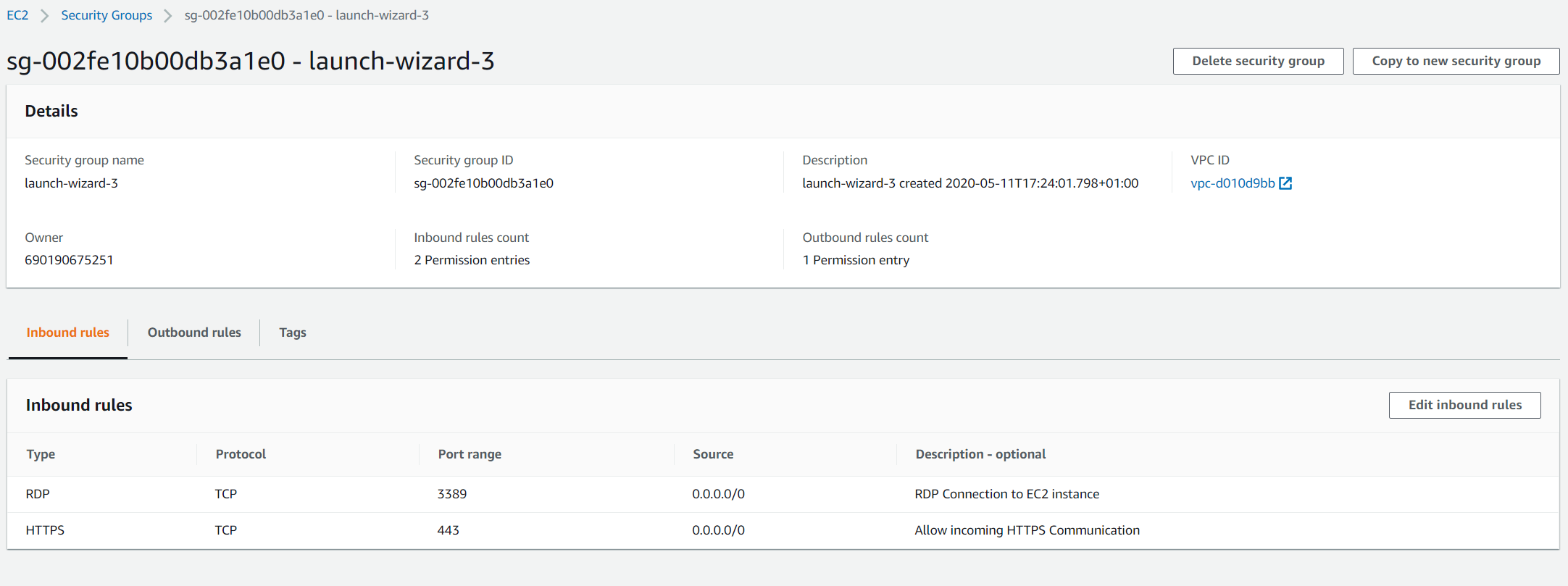 - inbound rules – create inbound rules used to define incoming communication to your Amazon EC2 instance. By clicking on view, you can see existing inbound rules.