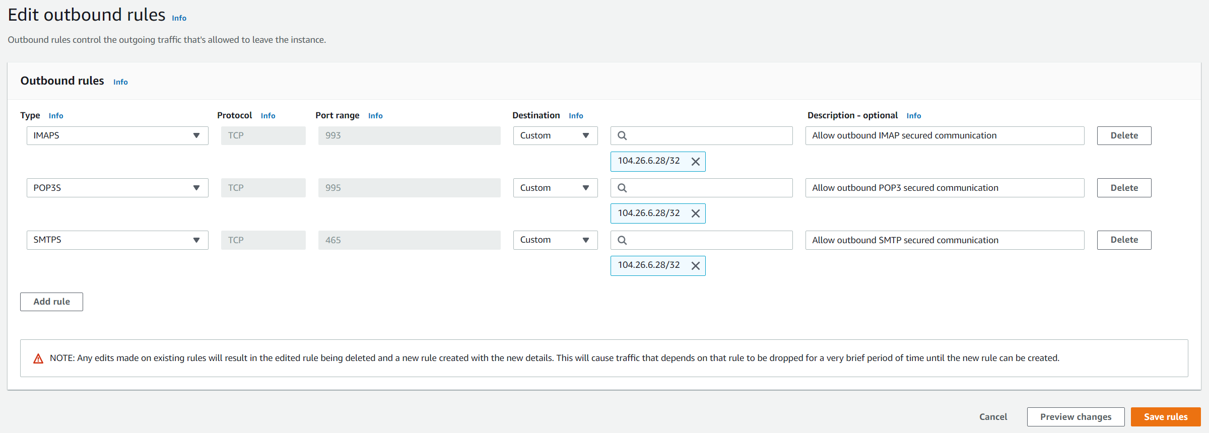 - Description – optional – A description for a security group rule.6. Click on Add rule and create a rule for POP3S and SMTPS