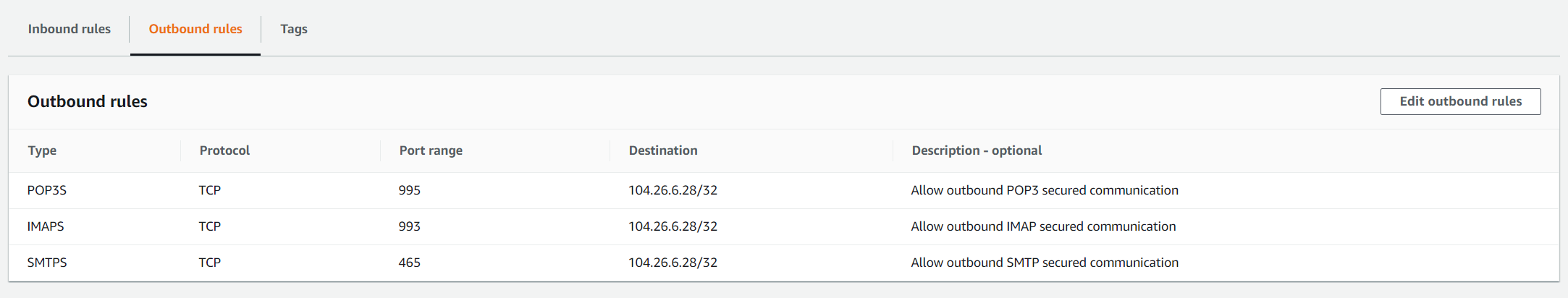 If your Amazon EC2 instance needs to reach email servers hosted somewhere on the Internet, you will need to enable IMAP, POP3, and SMTP outbound communication.