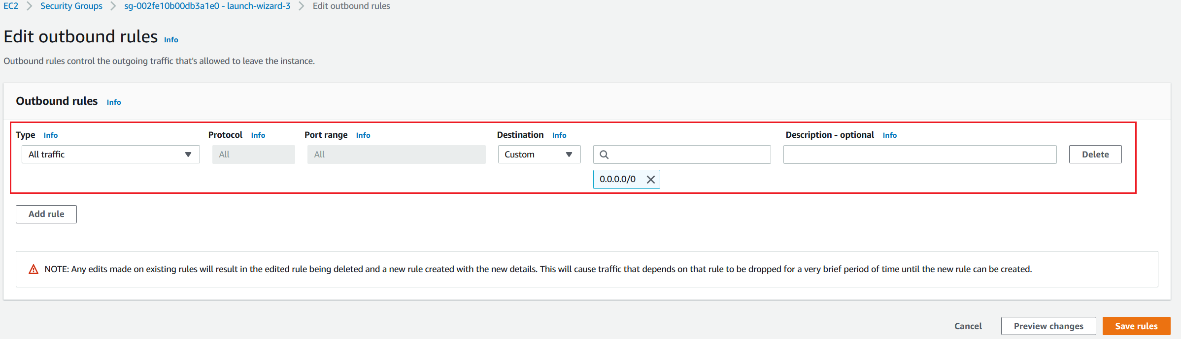 - Click on Edit outbound rules and delete All traffic rule by clicking on Delete