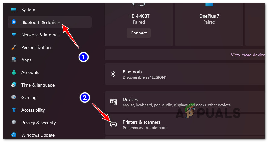 - Next, access the Bluetooth & devices tab from the menu on the left, then click on Printers & scanners from the menu on the right.