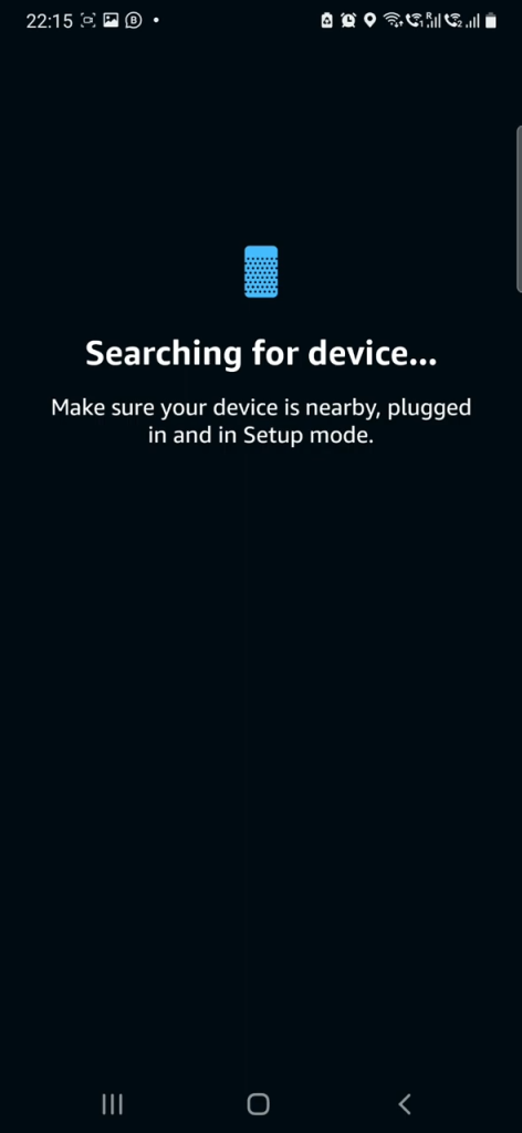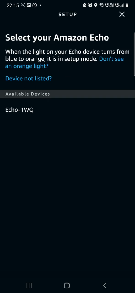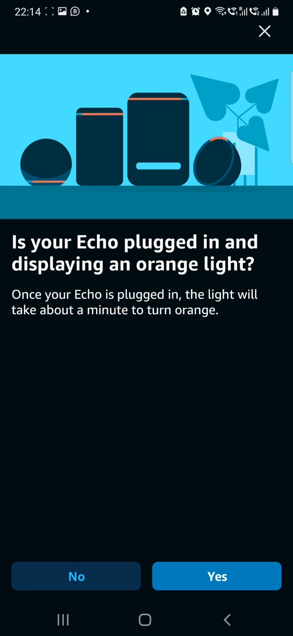 Select Amazon Echo Select your Echo device You might be asked for location and Bluetooth permissions, so allow those. - Next, it will show you a screen asking if your Echo device is turned on and in pairing mode—pulsing with an orange light. After you’ve turned it on, select Yes if it’s showing the orange light or No if it’s not. If you select No, it will show you on-screen instructions to pair it, otherwise it will start searching for Echo devices nearby if you select Yes.